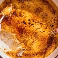 Right before serving, sprinkle an even layer of white sugar over the top. Use a kitchen torch to caramelize the sugar, moving in circles until the top is golden and crackly.