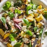 Once grill marks appear on both sides and the squash is cooked, remove from the grill and transfer to a serving platter. Slice the zucchini and yellow squash into 1 inch pieces. Crumble the sheet of feta on top, sprinkle with fresh mint and basil leaves and drizzle with the vinaigrette. Adjust salt and pepper as needed and serve immediately.