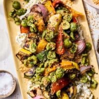 Grilled Vegetables with Whipped Feta are about to be your new favorite side dish. Imagine your favorite summertime vegetables cooked over the grill to bring out those subtle sweet notes and then served over a bed of whipped feta and a topping of briny olives and crispy panko. OMG it's heaven.