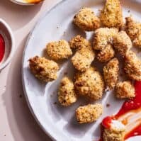 Working one piece at a time, dip each chicken cube into the egg mixture, allowing any excess to drip off. Then, using tongs, toss the chicken in the breadcrumb mixture until well coated. Place each nugget on the prepared wire rack, leaving about 1 inch of space between pieces.