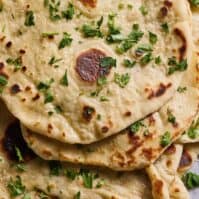 Remove the naan from the skillet, brush generously with the garlic butter, and sprinkle with a little kosher salt. Place the naan in a tea towel-lined dish to keep warm. Repeat with the remaining naan and serve immediately.