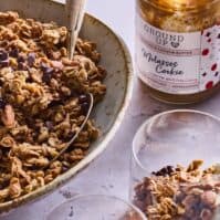 In a medium microwave-safe bowl, combine the Molasses Cookie Almond Butter, maple syrup, coconut oil, and vanilla extract. Microwave for 30 seconds, then stir until smooth and well mixed. Pour this mixture over the oat mixture and stir until evenly coated.