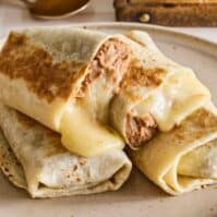 Place a tortilla on a clean work surface. Spread ⅓ cup of beans in the center of the tortilla. Top with ⅓ cup shredded cheese. Fold the left and right sides of the tortilla towards the center, covering part of the filling. This step helps keep everything neatly inside when you roll it.Starting from the edge closest to you, fold the bottom of the tortilla up over the filling. Tuck it tightly as you continue to roll the burrito away from you, keeping the sides folded in as you go. Roll until the entire burrito is sealed. Place the burrito seam side down on a baking sheet and continue to assemble the rest of the tortillas.Once rolled, you can place the burrito seam-side down in a hot pan to crisp it up and seal the edges. Heat a large skillet or braiser or dutch oven over medium-high heat. Place the burritos seam side down in the pan and cook for 2-3 minutes on each side until the seam is secured and the burritos are warm, the cheese is melted and the tortilla is the slightest bit crispy where it touched the pan.