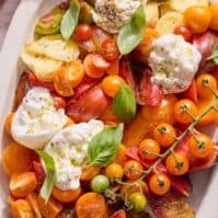 Arrange all the assorted tomatoes on a large serving platter and top with the burrata. Drizzle with olive oil, salt and pepper and garnish with basil. Serve immediately.