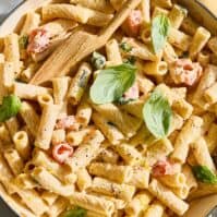 Reduce heat to low. Add the drained pasta to the skillet with the tomatoes and toss to combine. Stir in the whipped ricotta and a splash of reserved pasta water. Toss until the sauce is creamy and coats the pasta, adding more pasta water as needed.
